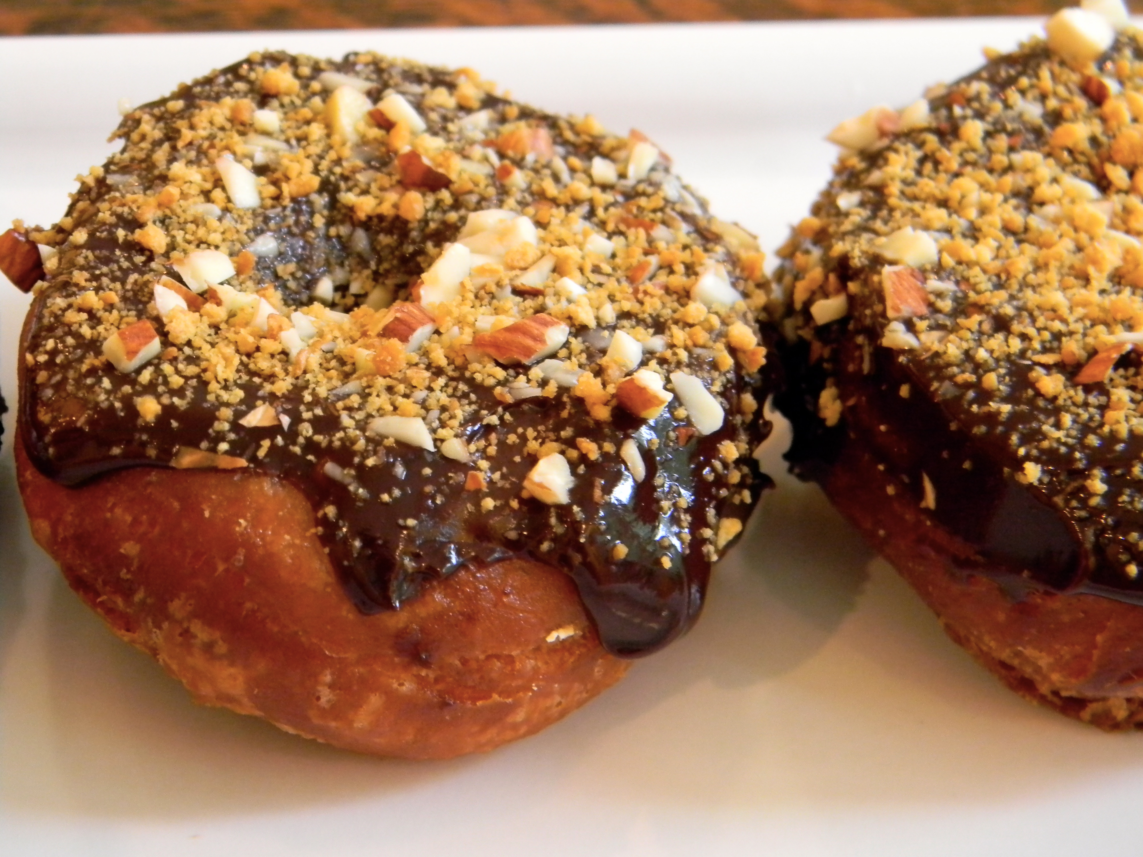 Today, I made doughnuts from scratch with a dark chocolate ganache, and sprinkled them with graham crumbs and chopped almonds. Not having a deep fryer was inconvenient but nothing insuperable. It just meant I had to regulate the temperature by removing the pot of oil from the heat from time to time.