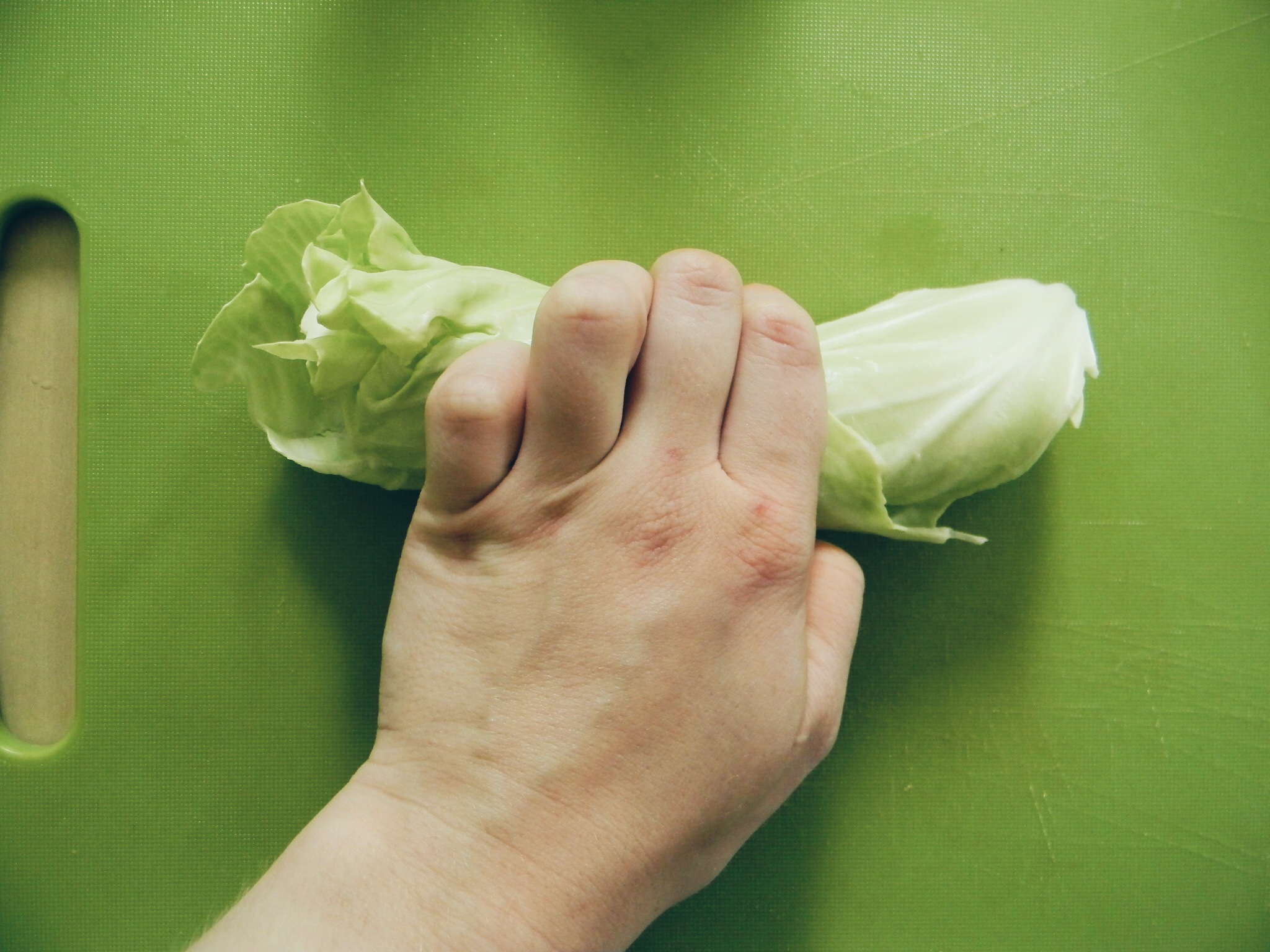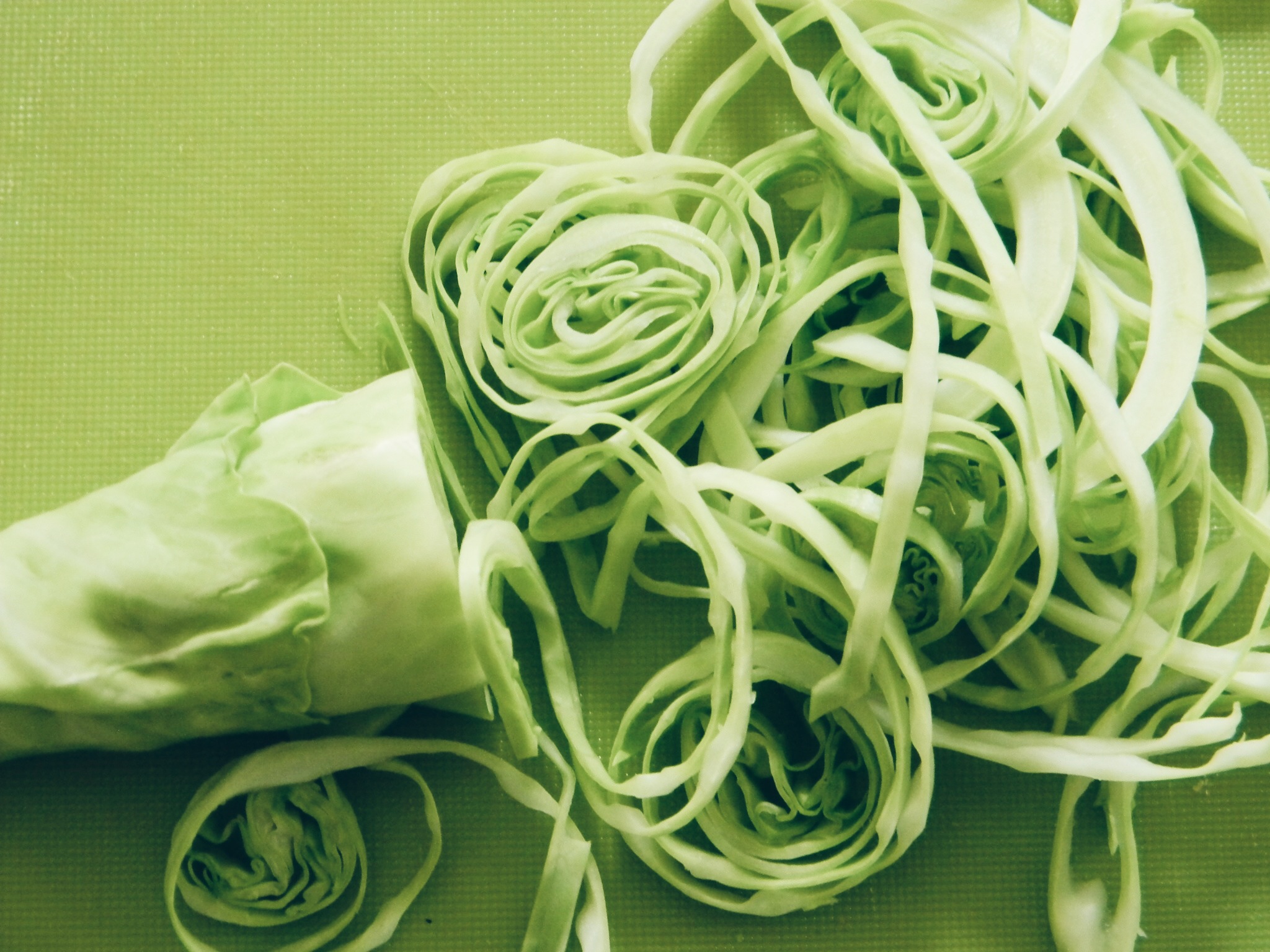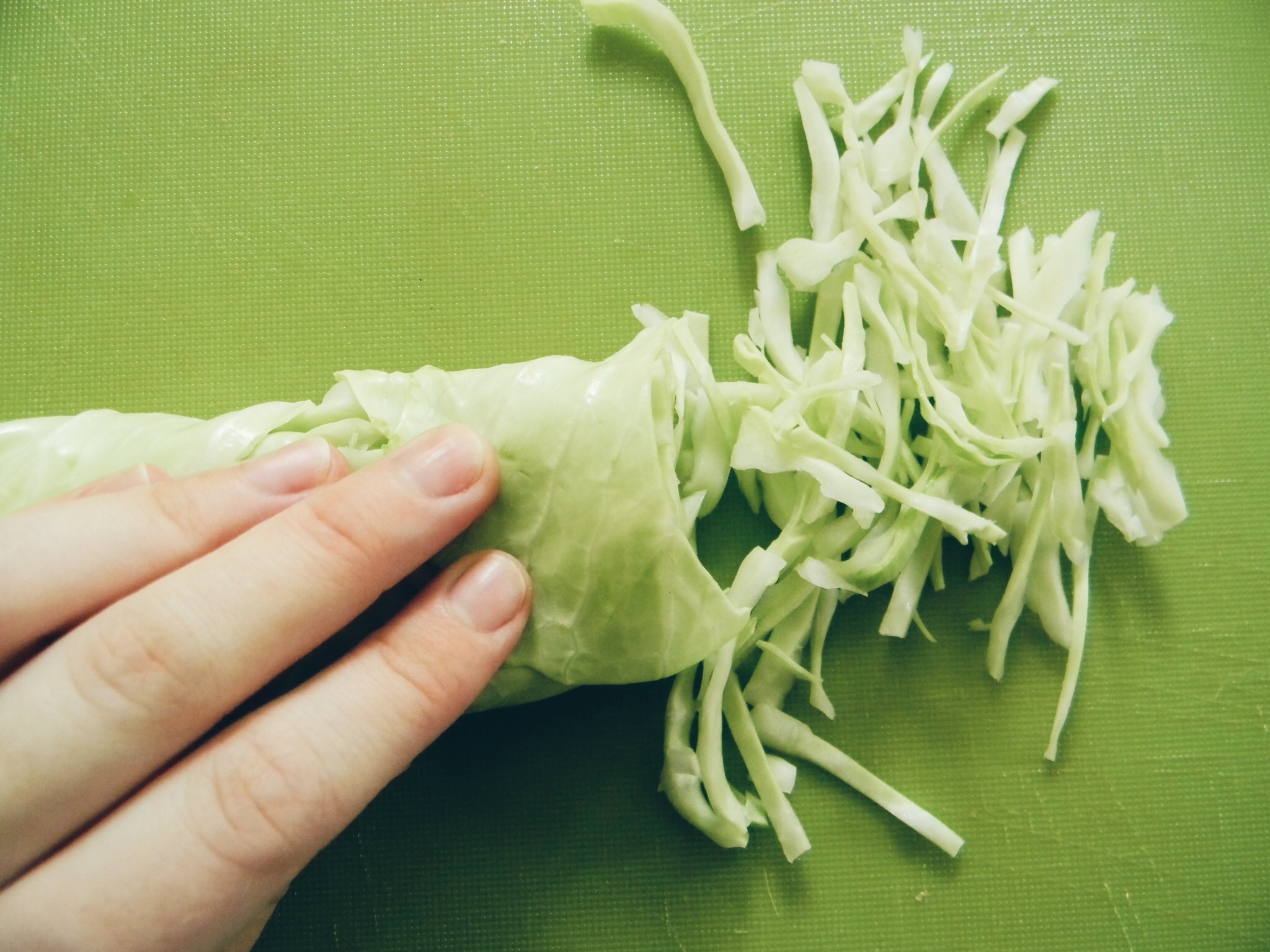- Shave 1mm sections off the rolled cabbage to obtain ribbons of cabbage.