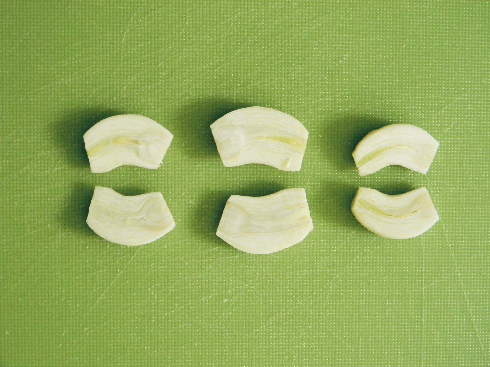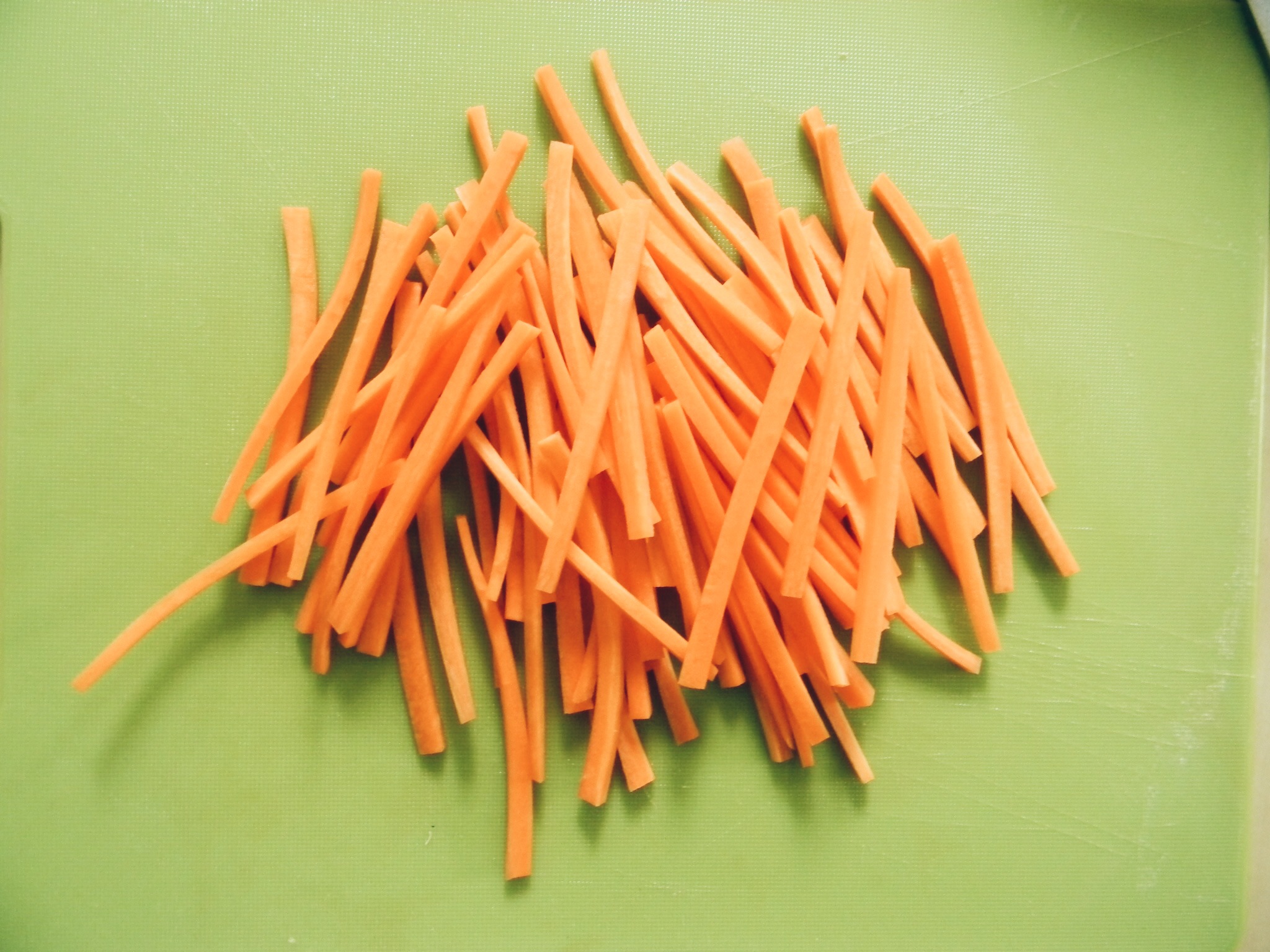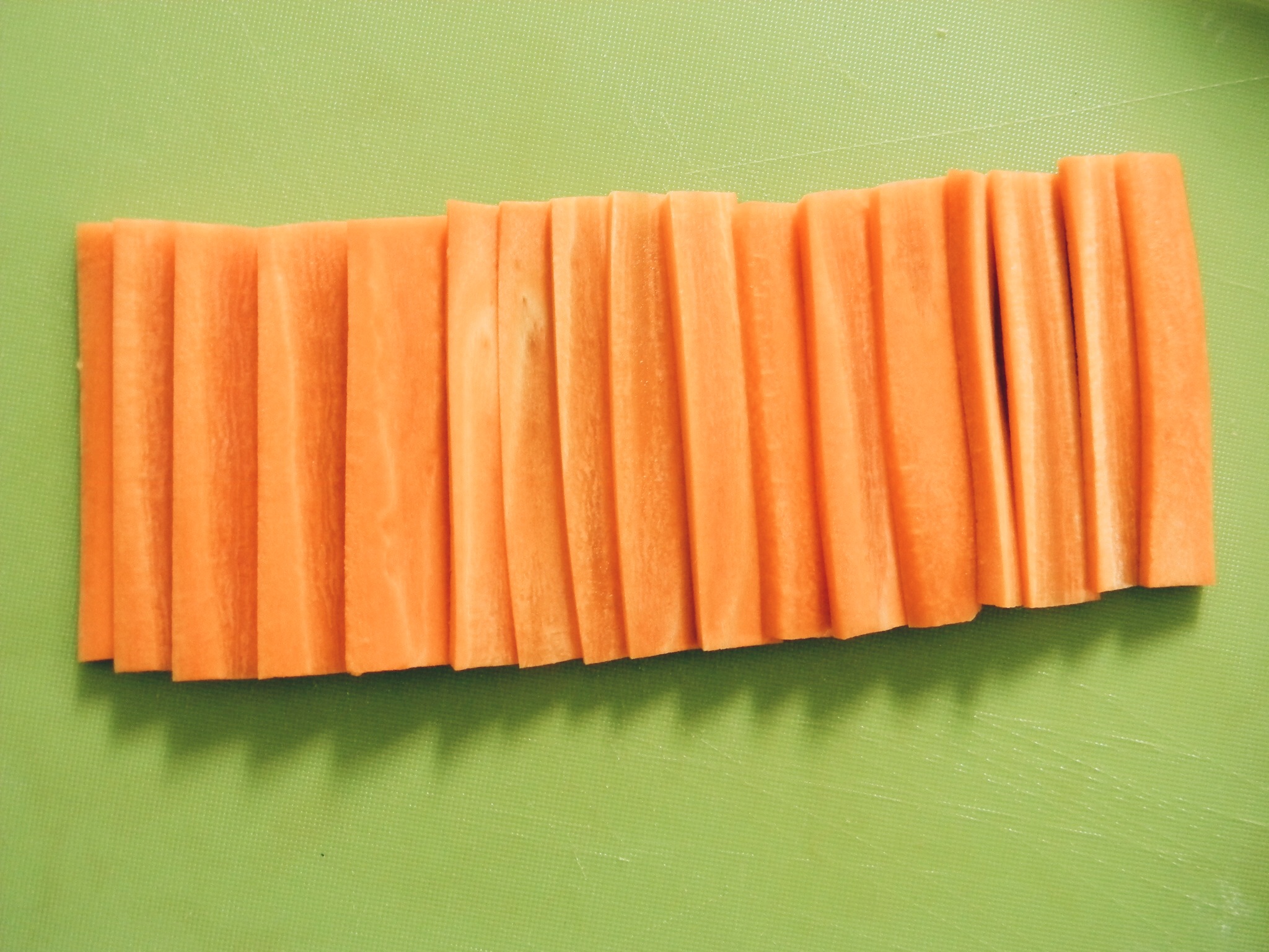 - Cut the carrot stick in 1-2mm thick plates lengthwise.