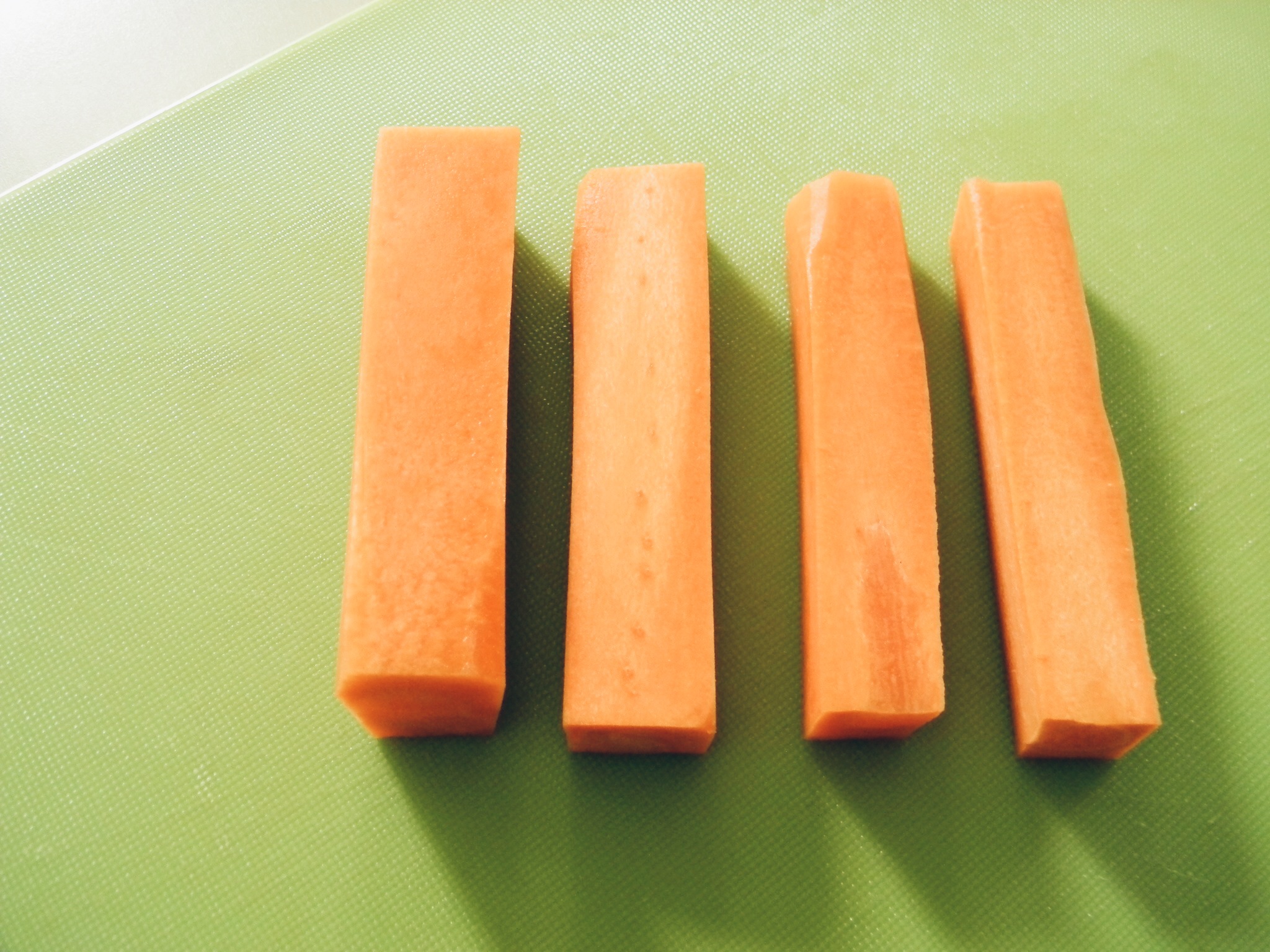 - Cut the carrot two to three pieces depending on the size. Cut where the size change is evident (usually this varies from 5-8cm).You want your whole carrot stick to be approximately uniform in width.