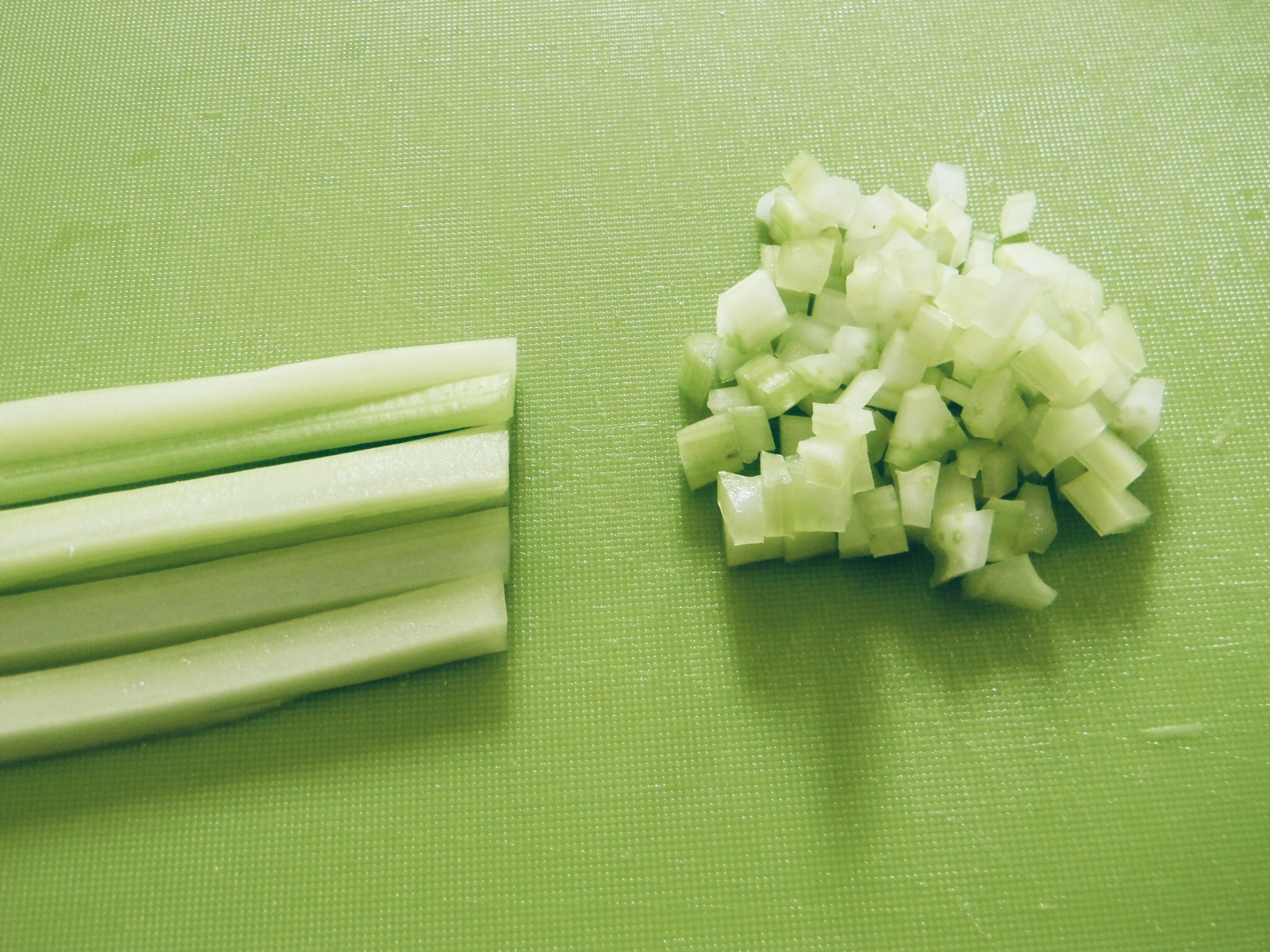 A brunoise cut is a small 3mm cube cut. To achieve this with the celery, cut the celery lengthwise into 3mm strips, then cut the strips into 3mm cubes. Depending on the size, try to create a cube following the width of the celery.
