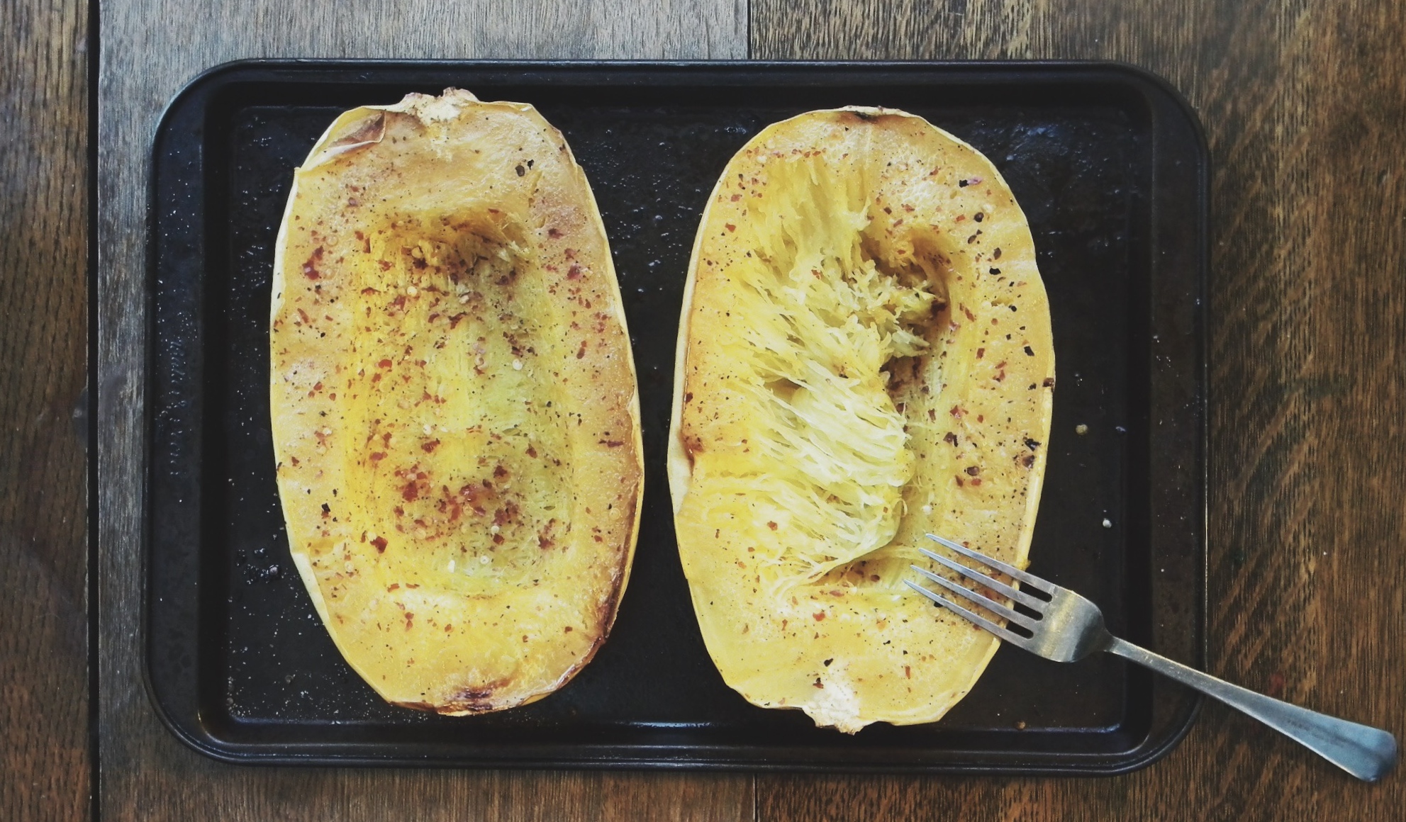 - Cut spaghetti squash in half lengthwise and remove all the seeds.