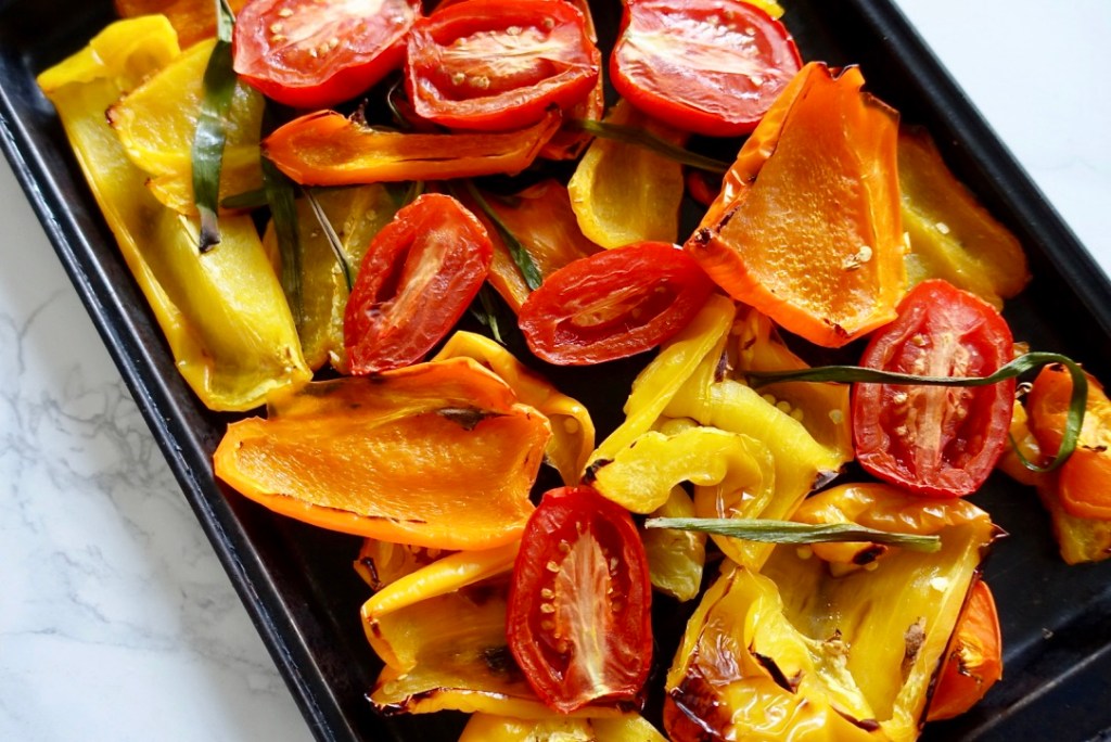 - Place peppers, tomatoes, and spring onions on a baking tray, ensuring not to overcrowd, and drizzle with olive oil.