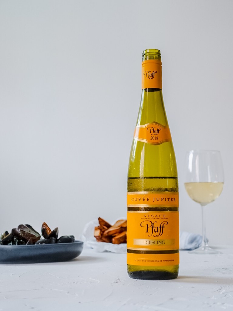 While cravings for comfort foods slowly surface with the change of season, I’m not yet willing to surrender the fresh and vibrant flavours of summer! This perfect balance is attained by combining the Pfaff Riesling Cuvée Jupiter and fresh parsley with citrusy lemon potato wedges! This wine is acidic and slightly dry with notes of green apple, pear, citrus and honey. When integrated in a simple mussel dish, it really brings out the natural sweetness of the shellfish.