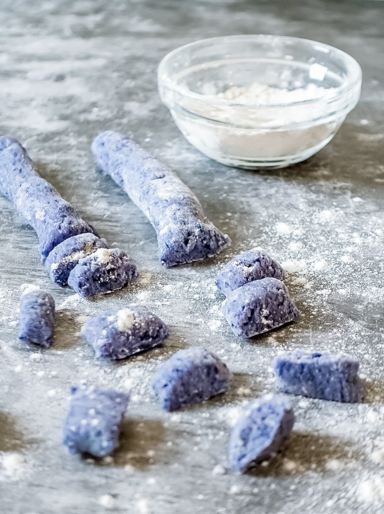 - Slice the dough into 1cm pieces and toss in flour to avoid sticking.
